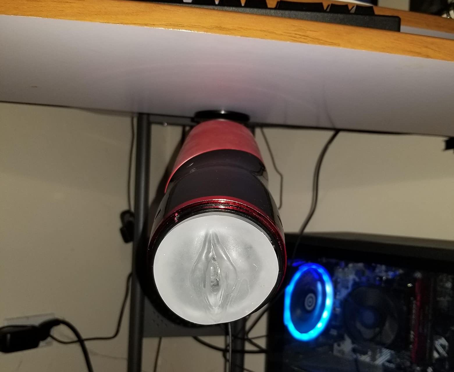 So first things first, my biggest concern when looking at this was thinking it was going to be a pain to clean. Getting the masturbator out, cleaning it, then somehow managing to force it back in is gonna be like repacking a tent i thought. But no, it pops out and back in so easily i wasn't even worried about removing it just for a picture lol.The suction cup works great, has a real good hold as you can see from the last picture and once you get it in the right position and find the right speed it's just amazing. Only downside is finding that position lol. Since the head moves but the case doesn't you can't be too close but if you're too far it'll slip off, but that's nothing a few minutes of trial and error with placement won't solve and after that I'd recommend marking the spot under the desk with a pen or marker so it's never a concern again. 5 stars, very much enjoyed.