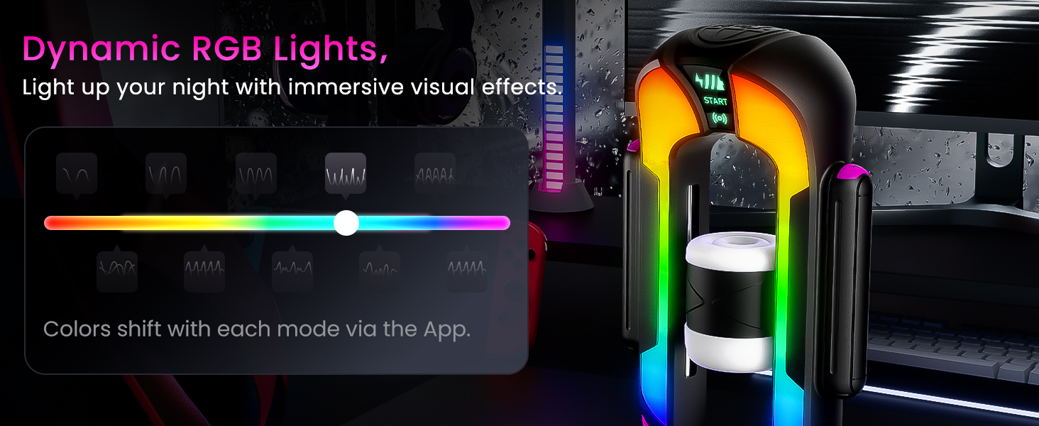 6. Ergonomic Grip with Dynamic RGB Lighting: Built with a comfortable grip that stays steady during long sessions, the design includes immersive RGB lighting that shifts through vibrant colors. The combination of ergonomic handling and tech-inspired lighting makes this male sex toy stand out from standard pocket pussies and blowjob machines